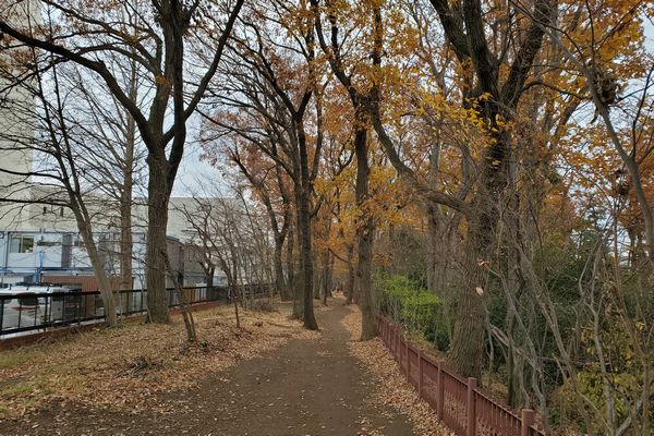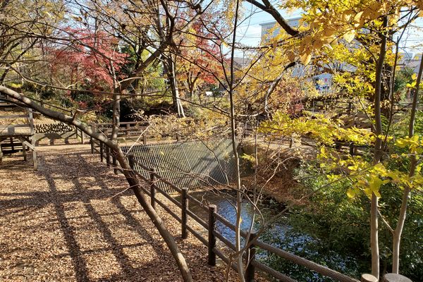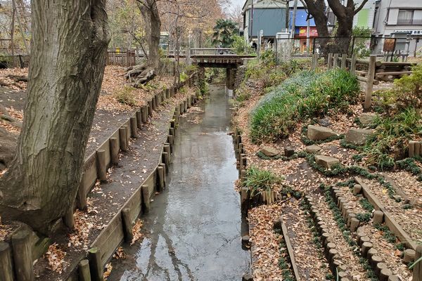 西武国分寺線を渡ると、左側に小平中央公園があります。線路を渡ってすぐの新堀用水には水辺に降りる階段があります。今は冬なので誰もいませんが、夏には子供が遊ぶ風景が見られるのでしょうか。このあたりの新堀用水はきれいに整備されています。