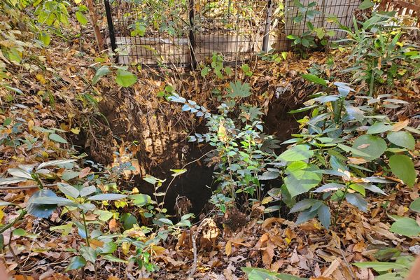 『こもれびの足湯』から少し歩くと、鉄柵が現れます。この付近の新堀用水は、胎内堀と言われるトンネルの中を通っています。鉄柵の中に直径は1メートルぐらいの縦穴があり、胎内掘り工事をした人が出入りしたり、土を運び出した穴だそうです。鉄柵は4ヵ所あるそうですが、現在、法面の保全工事を行っており、1ヶ所しか覗けませんでした。