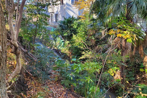 下の右下の写真にあるように玉川上水の底から両岸の法面の状況が良く見えます。南向きと北向きで日射の影響が異なるので、崩落のメカニズムが違ってくるようです。詳しくはこちらの資料に解説があります。