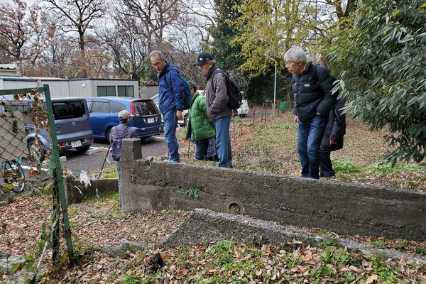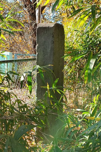 小島精米店は、今はコンビニになっており、その裏手の樹林地の中に水車の土台の一部が痕跡として残っています。