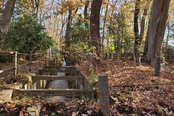 そのまた少し下流、玉川上水が五日市街道と接する場所の近くに小川水衛所跡があります。ここは、江戸時代には水番所として水番人が常駐して、玉川上水の管理をおこなっていました。明治維新後は、水衛所として、淀橋浄水場が廃止され玉川上水の通水が停止するまで、運用されていたとのことです。現在は、散策路が整備され、ベンチなども置かれ、市民の憩いの場となっています。