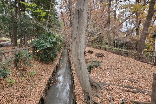 しばらく玉川上水と新堀用水の間の樹木の中の小道を歩きます。ところどころで新堀用水は地下に潜ります。