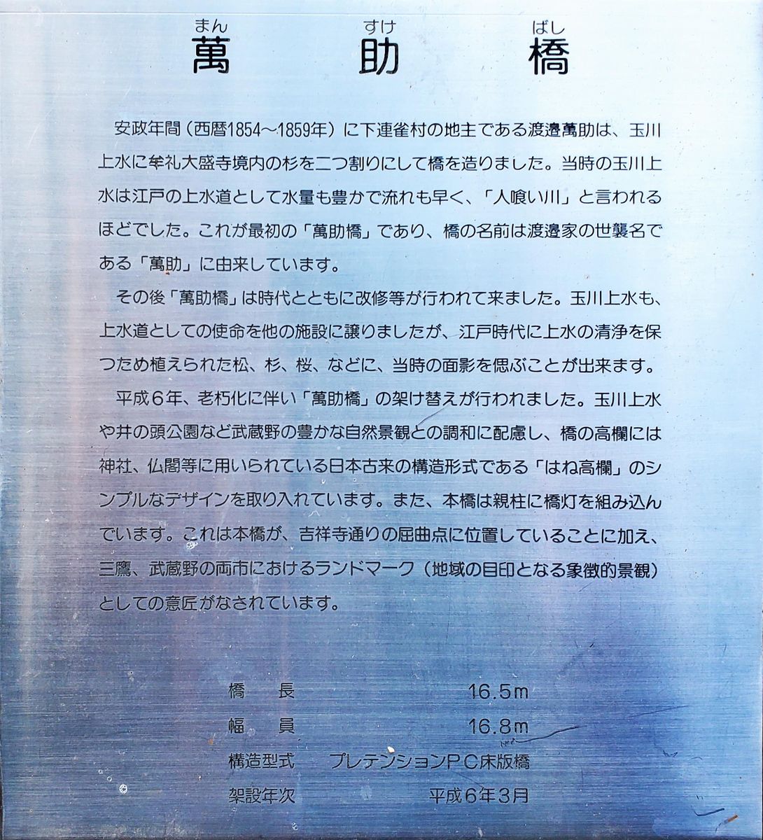 井の頭公園に着きました。 吉祥寺通りに架かる橋は、萬助橋です。名前の由来の掲示がありました。