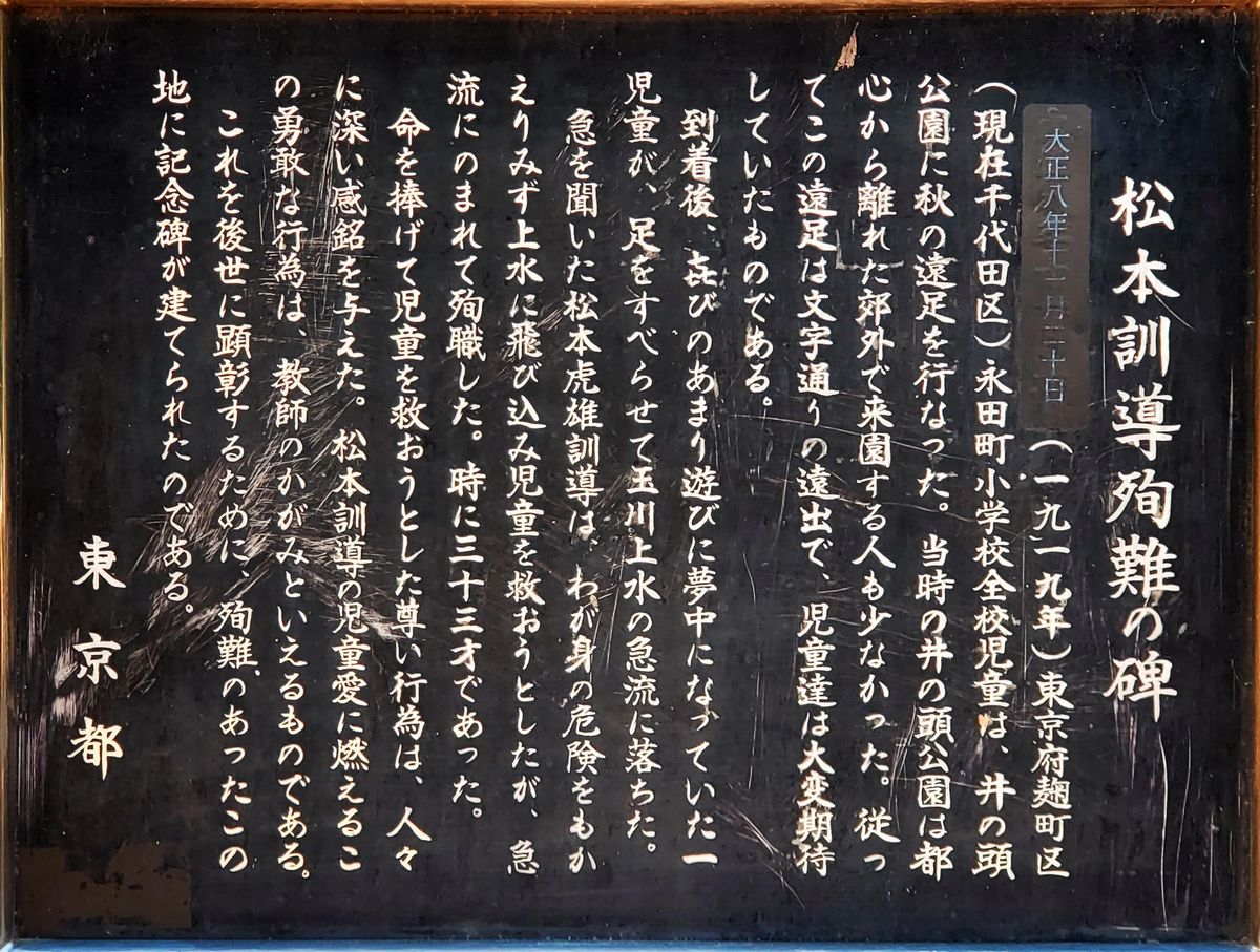 玉川上水に近いところに「松本訓導殉難の碑」があります。 1919年、東京永田町の小学校の児童が秋の遠足に来た時、一人の児童が玉川上水に落ちたのを救おうとして殉難した松本訓導の行為を顕彰するために建てられたものです。