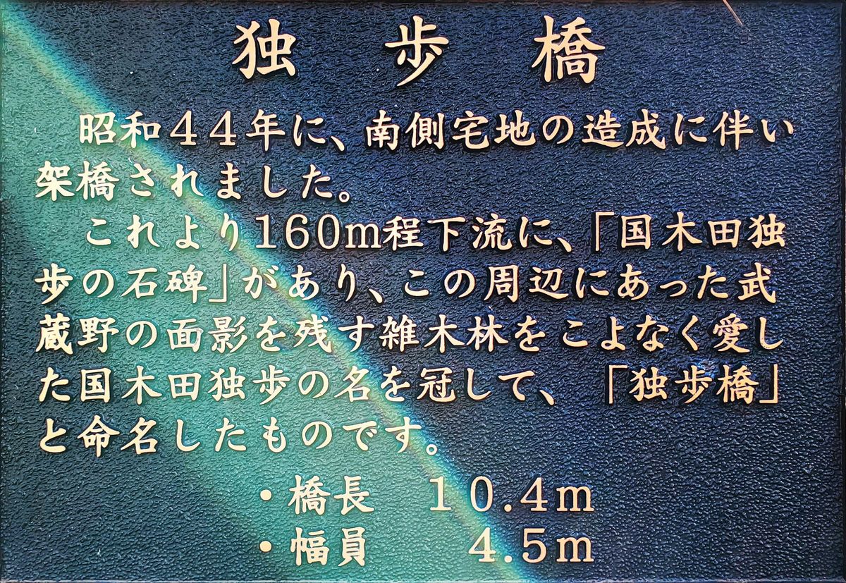 そこに架かる桜橋の傍らに『国木田独歩文学碑』があります。碑には国木田独歩の『武蔵野』の中で桜橋が記述されている一節が刻まれています。