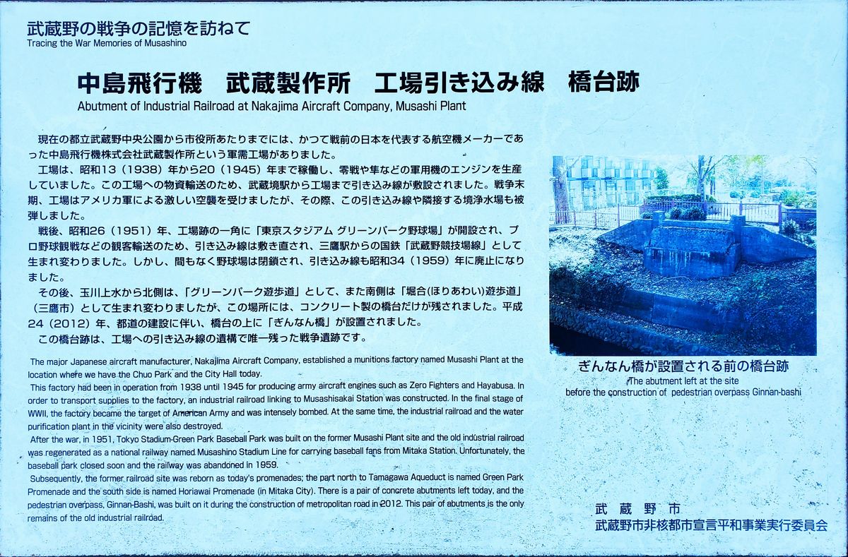 ぎんなん橋の場所には、かつて、中央線から中島飛行機株式会社の武蔵野工場(現在の武蔵野中央公園)まで引き込み線が通っていて、橋台跡の上にぎんなん橋が架けられました。
