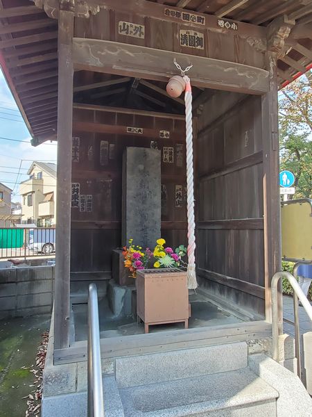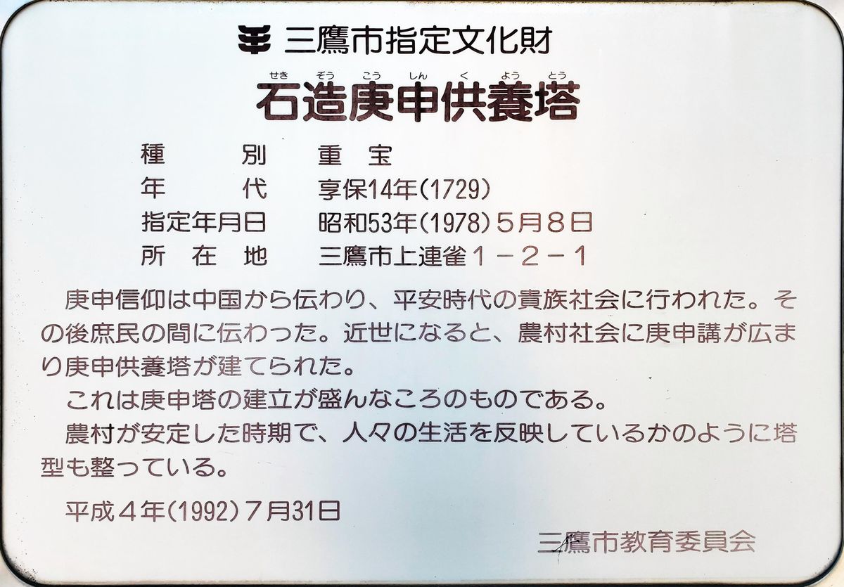 三鷹通りの大きな交差点のけやき橋の傍らにひっそりと庚申供養塔が祠に納まっています。 説明板によると、1729年(享保14年)のものだそうです。