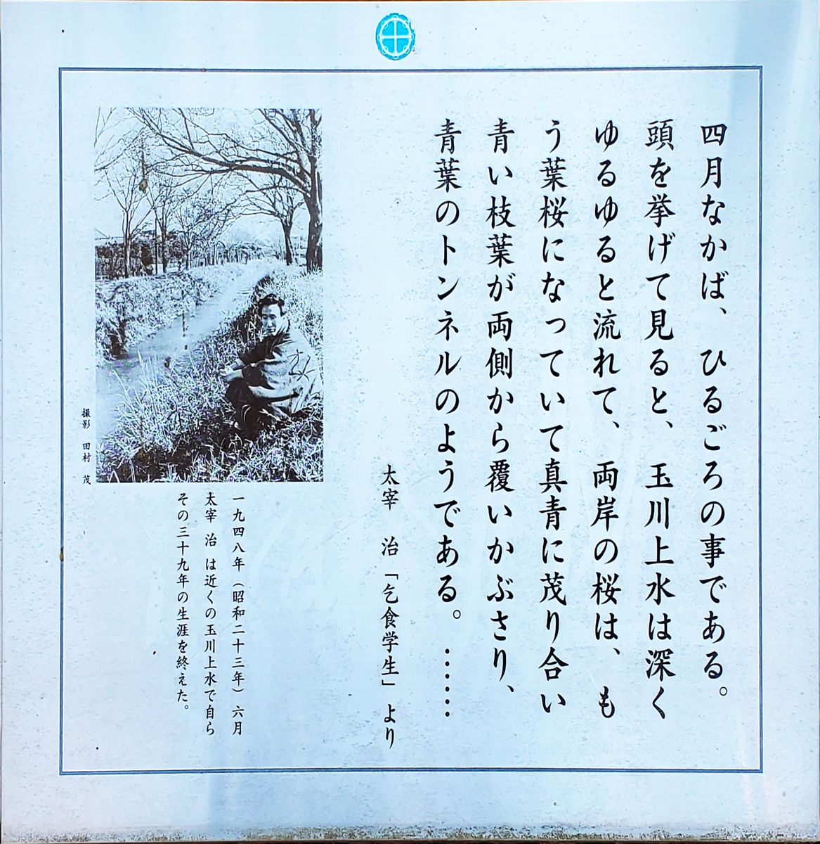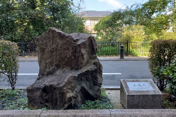 風の散歩道を歩いて、むらさき橋の少し手前に、太宰治の入水の地を示す表示板があります。小説「乞食学生」の一節が記されています。また、その少し先に、玉鹿石があります。 玉鹿石は、太宰治の出身地である青森県北津軽郡金木町から産する石で、青森県の天然記念物に指定されています。