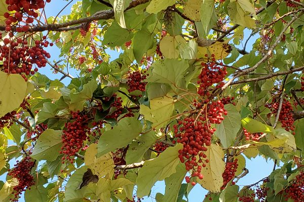 桜橋の広い道を渡った玉川上水の岸に大きなイイギリが赤い実を付けていました。