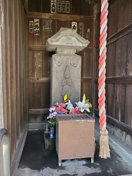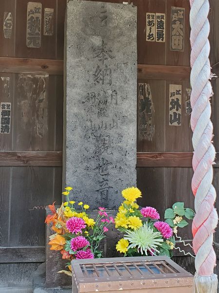 庚申供養塔の左側面に「観世音」と刻まれた石塔があります。 「月山」「湯殿山」「羽黒山」と刻まれた文字が読めます。