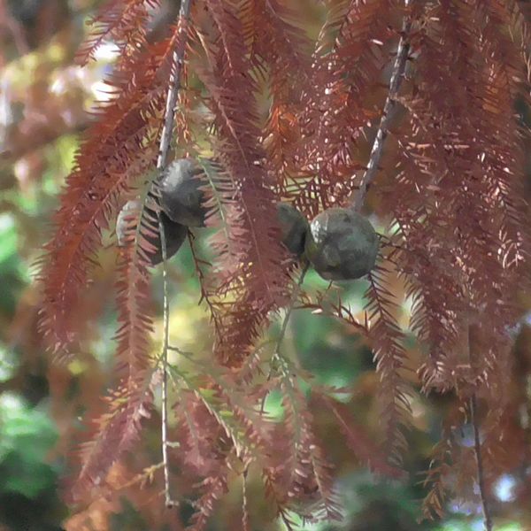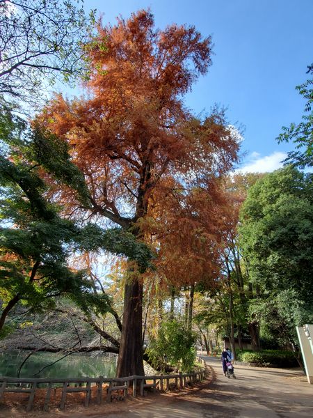 池の畔に大きな木が紅葉しています。 メタセコイアに見えますが、実の形から、ラクウショウ(落羽松)かもしれません。