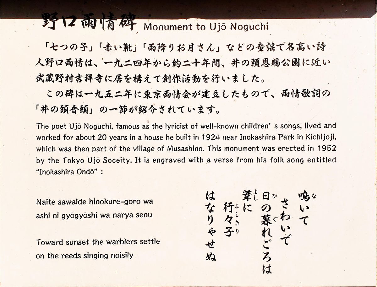 碑には「井の頭音頭」の一節「鳴いてさわいで日の暮れごろは葦(よし)に行々子(よしきり)はなりゃせぬ」と刻まれています。