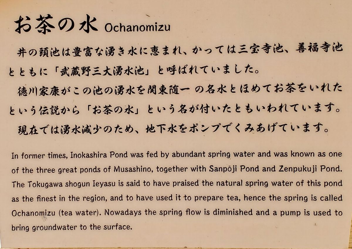 そのすぐ先、池の上流側の端に「お茶の水」と呼ばれる湧水があります。井の頭池の水源の一つでしたが、現在は、ポンプで地下水を汲み上げているそうです。