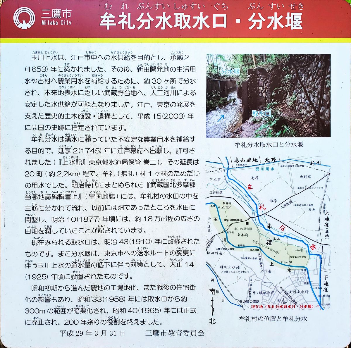 説明板によると、「牟礼分水は湧水に頼っていた不安定な農業用水を補給する目的で、延享2年(1745)に江戸幕府へ出願し許可されました」とあります。
