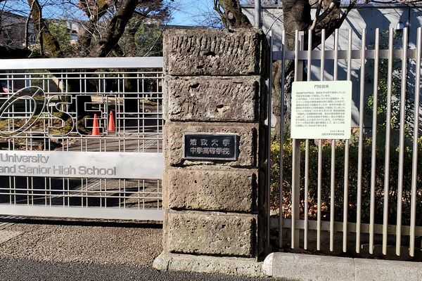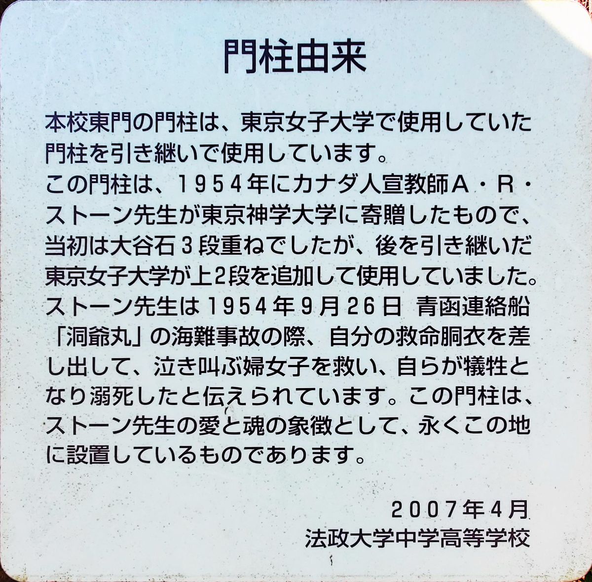 そのすぐ先に学校の校門があります。ここは以前、東京女子大学があったところで、門柱は、1954年にカナダ人宣教師A.R.ストーン先生が東京神学大学に寄贈したものだそうです。