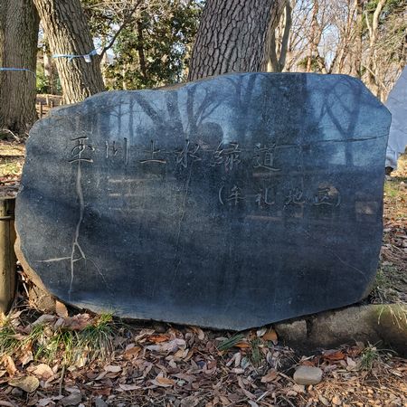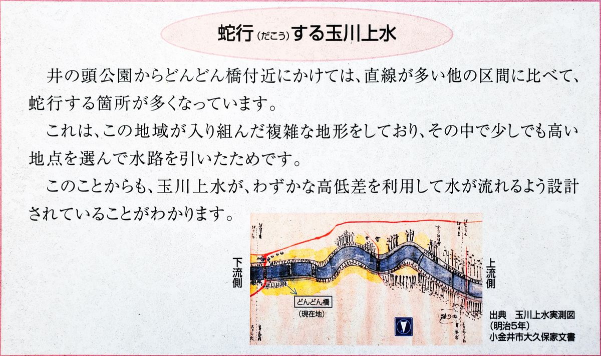 玉川上水は、井の頭公園あたりからこの付近まで、大きく蛇行して流れています。井の頭池は、武蔵野台地の扇状地の端に位置していて、この付近から傾斜が緩くなります。 玉川上水は、少しでも標高の高い所を選んで水路を引いたため、このように曲がりくねったと、説明板にありました。