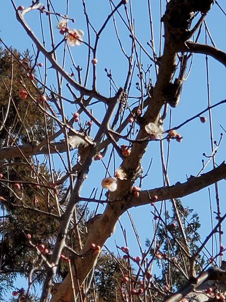 寒い日でしたが、気の早い梅の花がちらほら咲き始めていました。