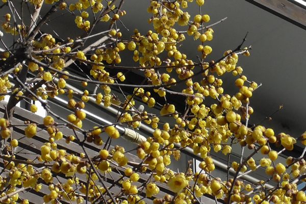 緑道の傍らの住宅のロウバイが咲き始めています。まだ丸い蕾がほとんどです。