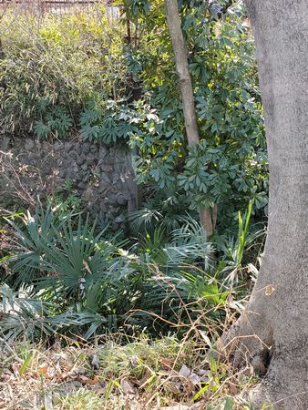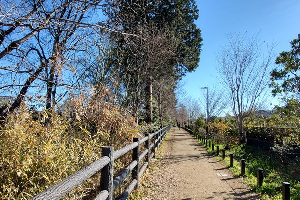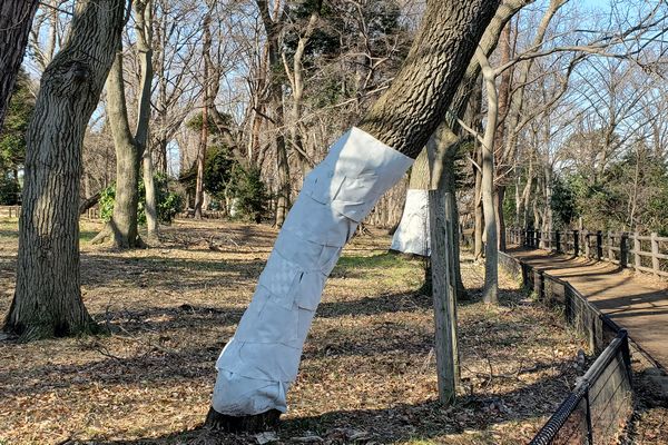 松影橋の下流、右岸側に法政大学中学高等学校に隣接して玉川上水緑道の雑木林があります。ここでもナラ枯れの被害が出ているようで、粘着シートが巻いてある木が何本かありました。