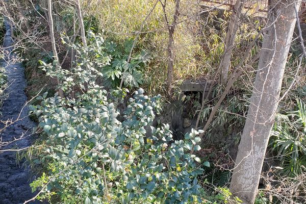 草に隠れて見えづらいですが、岩崎橋の上から下流側のすぐのところに烏山分水口跡が見えます。