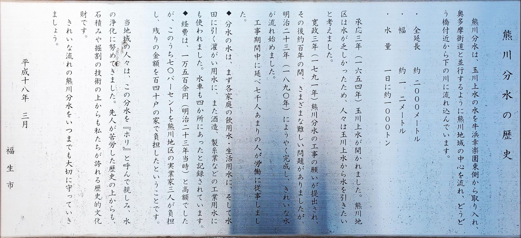 熊川分水は、寛政3年(1791)に工事の願いが出されましたが実現せず、その後約100年後の明治19年にようやく許可が下り、3年の歳月と総額一万円余の費用をかけて明治23年1月に完成しました。石川弥八郎を始めとする熊川地区の実業家3人が費用の70%を負担しました。