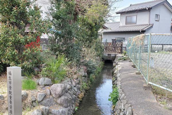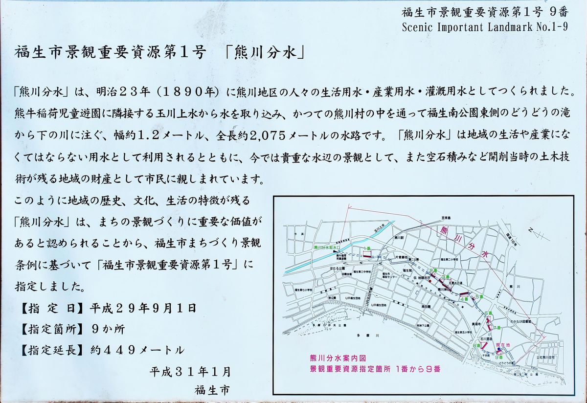 奥多摩街道に沿って歩き、五日市線の踏切の手前の路地を入ると、熊川分水が顔を出していました。「福生市景観重要資源第1号(熊川分水)1番」の表示があります。