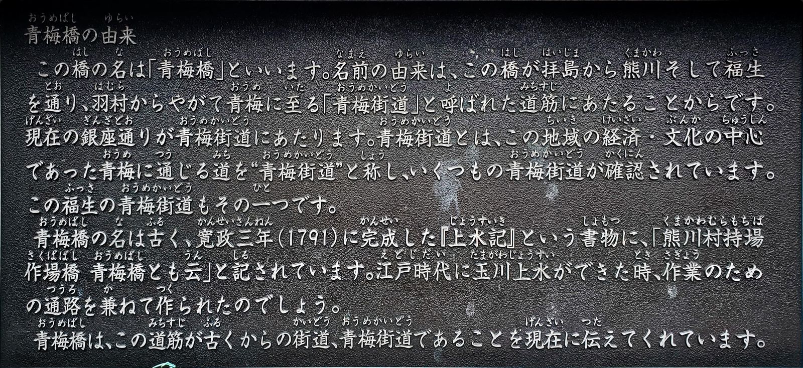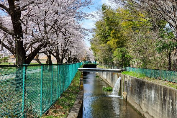 牛浜駅から玉川上水の下流の方に歩き、ほたる通りの青梅橋から上流の方を見ると、その先に熊川分水取水口が見えます。熊牛稲荷のすぐ脇のところです。