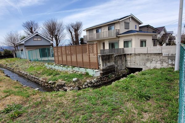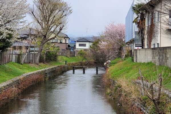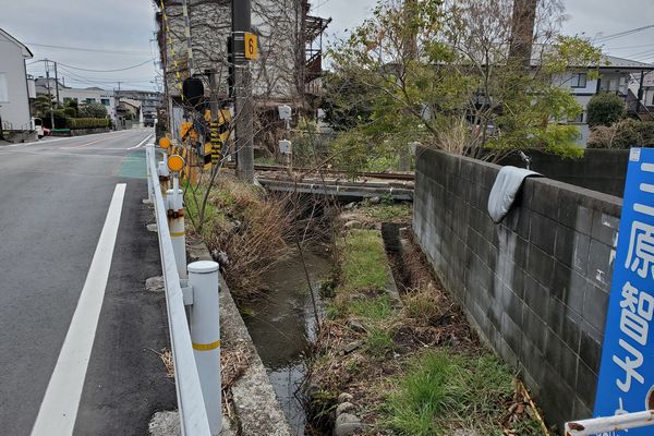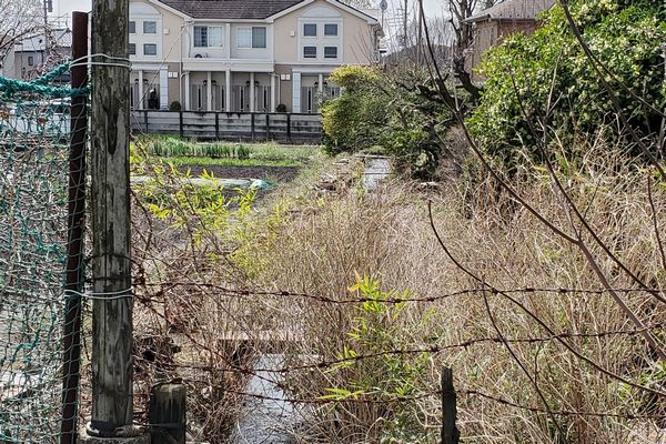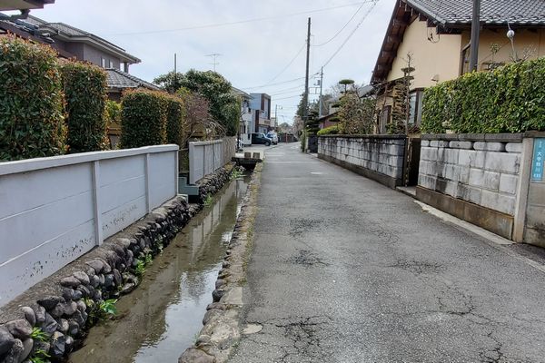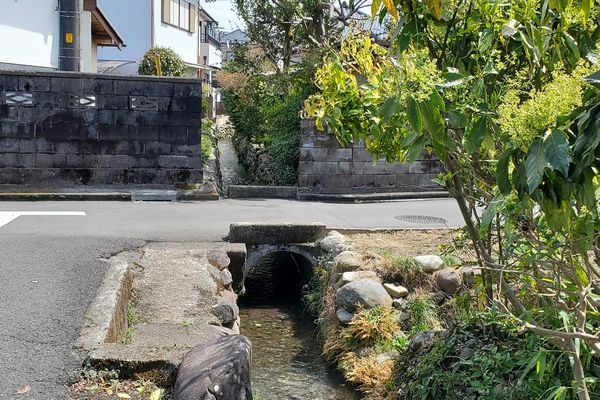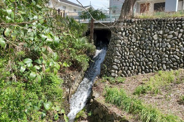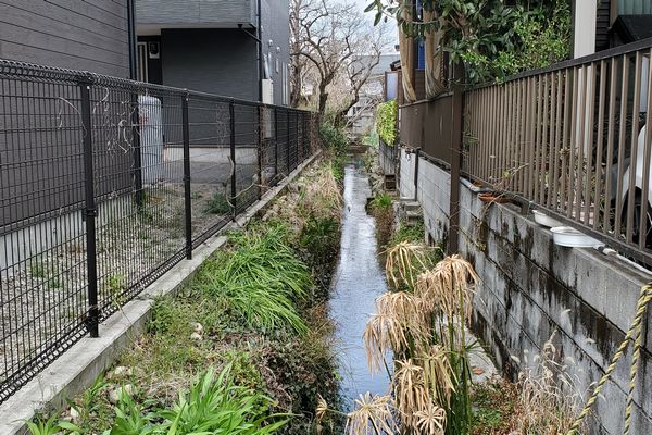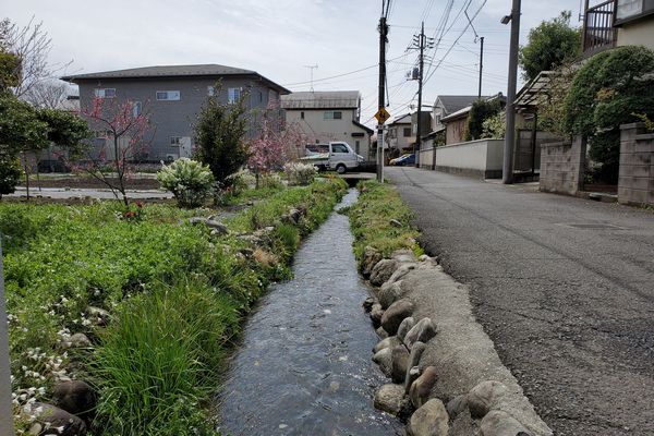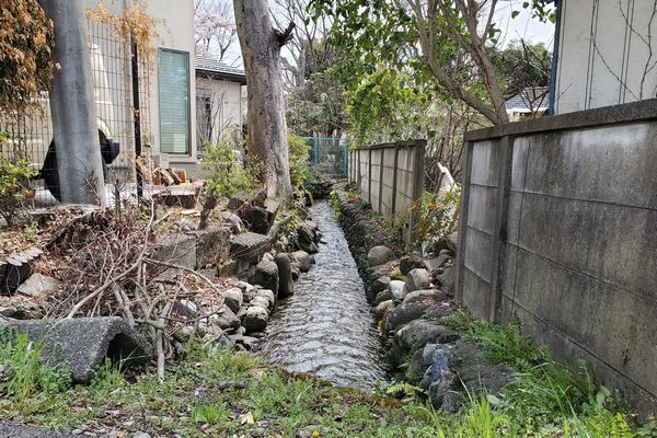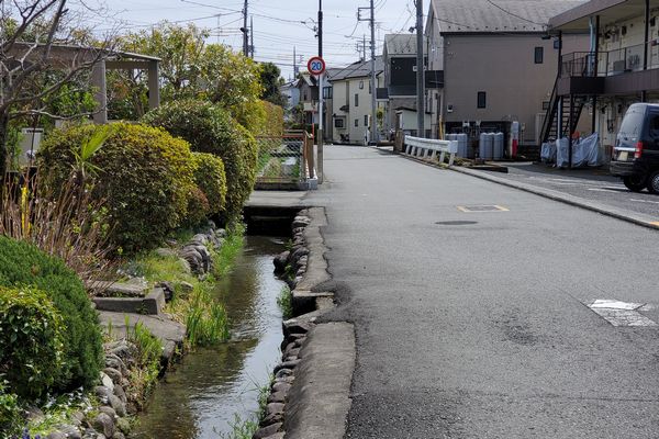 消防署の正面に沿ってぐるっと回って片倉跡地の向こう側に出ると、熊川分水は跡地を抜けて出てきて、その後は住宅の間を流れて行きます。