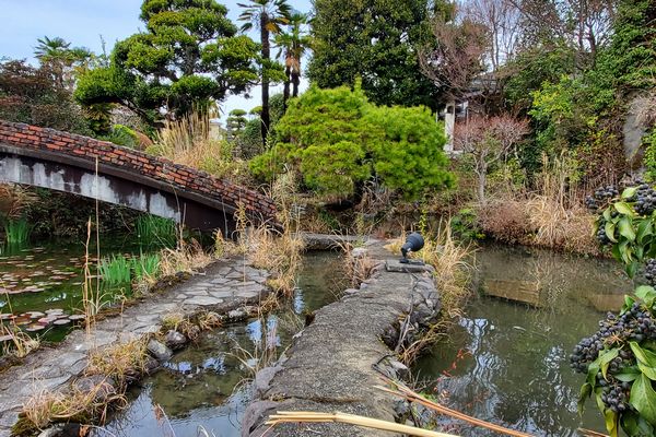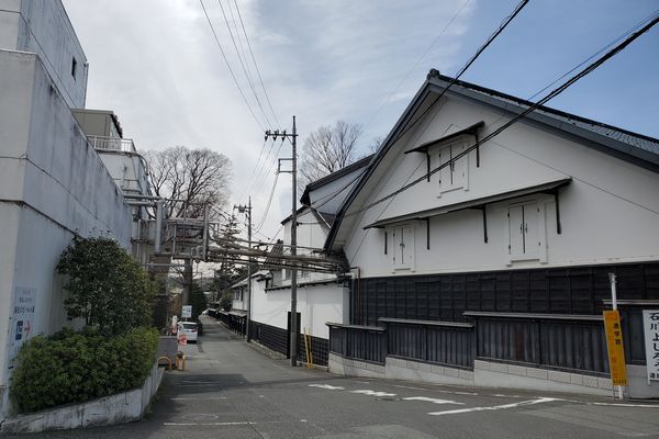 取水口で玉川上水から分れた熊川分水は、すぐに料亭幸楽園の敷地の中に入ります。 ほたる通りを歩いて、奥多摩街道にぶつかる手前の料亭幸楽園の入口の駐車場の脇で、熊川分水は顔を出しますが、再びほたる通りの下へ潜って行きます。