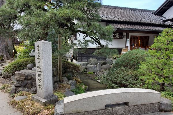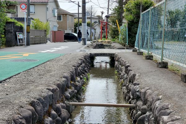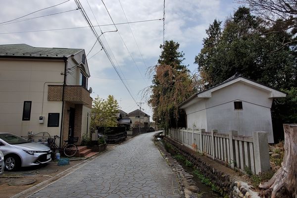 熊川分水は、睦橋通りを渡って、稲荷社の手前を右に折れて屋敷の間を流れて行きます。