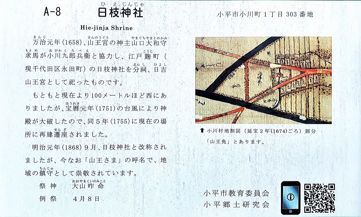 「1658年(万治元年)山王宮の神主山口大和守求馬が小川九郎兵衛と協力し、江戸麹町(現千代田区永田町)の日枝神社を分祠、日吉山王宮として祀ったもの」と説明板にありました。