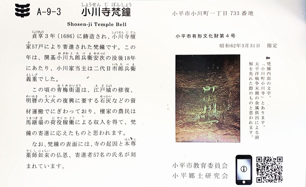 貞享3年(1686)に鋳造され、小川寺檀家57戸から寄進されたものです。小川九郎兵衛没後18年に当たります。