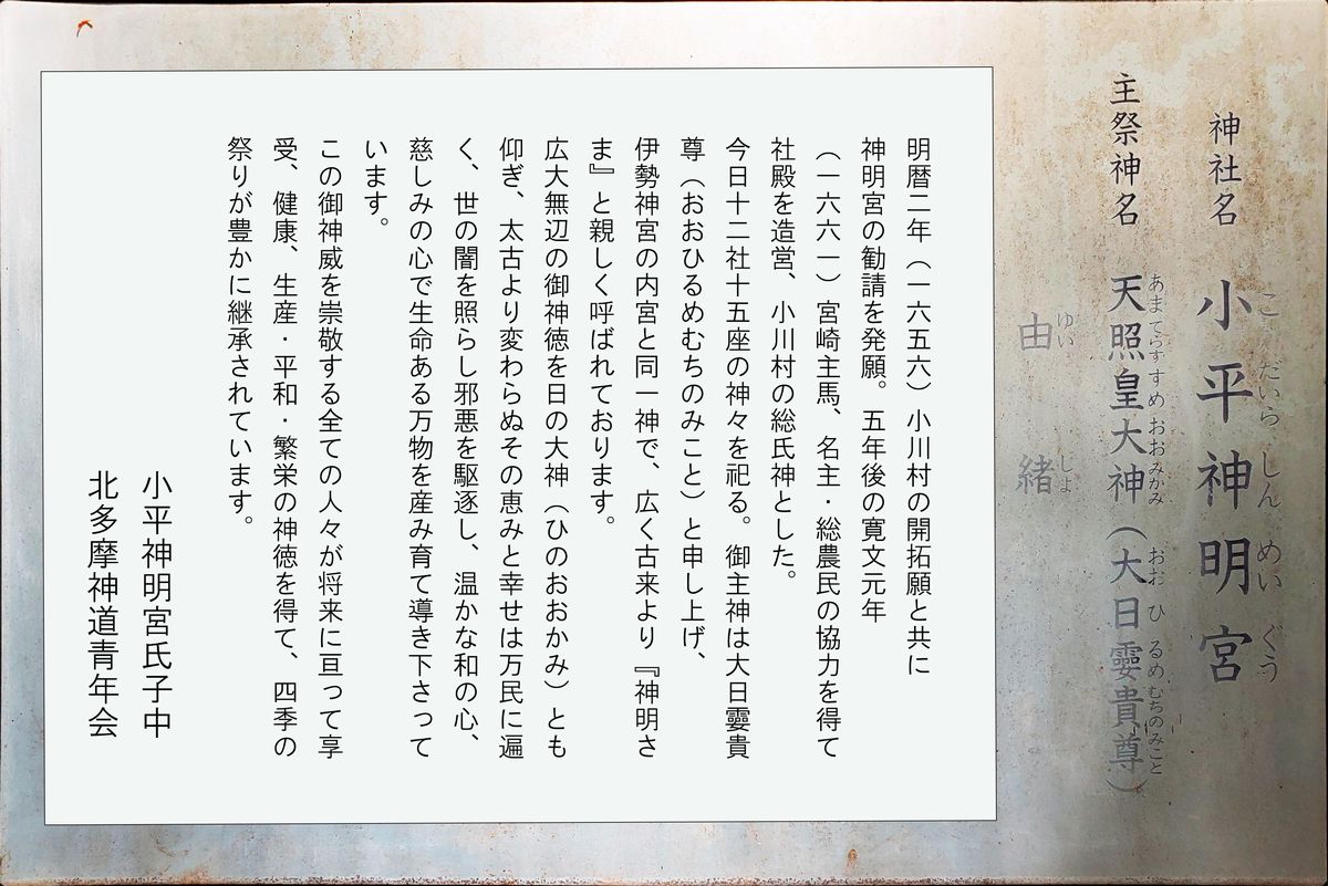 明暦2年(1656)、小川九郎兵衛により、小川村の開拓願いと共に神明宮の勧請が発願されました。5年後の寛文元年(1661)に、多摩郡殿ヶ谷村(現在の瑞穂町)の阿豆佐味天神社の摂社で岸村神明ヶ谷の神明社を勧請し、社殿を造営、小川村の総氏神としたのが小平神明宮の始まりです。 説明板が設置されていました。