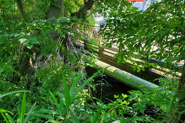 小川用水の取水口は、新堀用水の小川橋の下、上流側の際にあります。夏のこの時期は笹が生い茂って見通せませんでした。