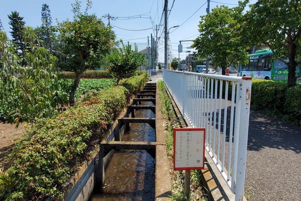 小川用水の北側の流れは、小平神明宮の参道を横切って青梅街道に沿って流れています。