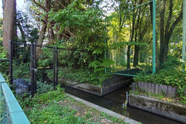 けやき通りを渡ったところ、けやき通りに面して、青梅街道から立川通りまで、小川緑地と児童公園になっています。小川用水は、青梅街道に沿って、小川緑地の脇を流れ、緑地の先で直角に折れ、緑地の縁に沿って屋敷の中を流れます。 用水の水は一部緑地の中に流れ込んでいます。