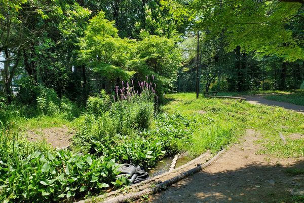 小川緑地の中に入った用水の流れで、ビオトープのような水辺が作られており、小川用水に戻ります。
