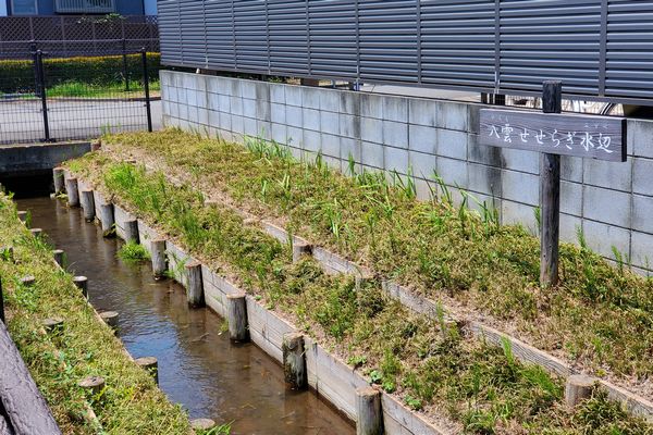 小平神明宮の参道を挟んで、小川用水の上流側と下流側の一部は、青梅街道に沿って、ちょっとしたせせらぎになっています。「八雲せせらぎ水辺」という名前がついています。