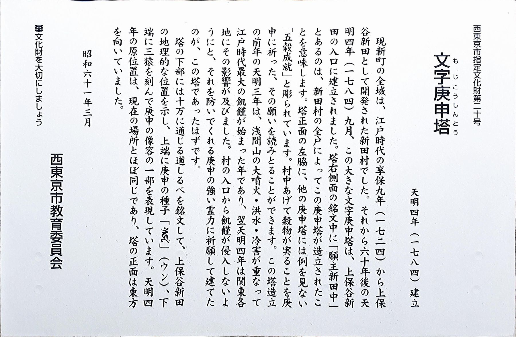 天明4年(1784)に当時の上保谷新田の入口に建立された、庚申塔です。