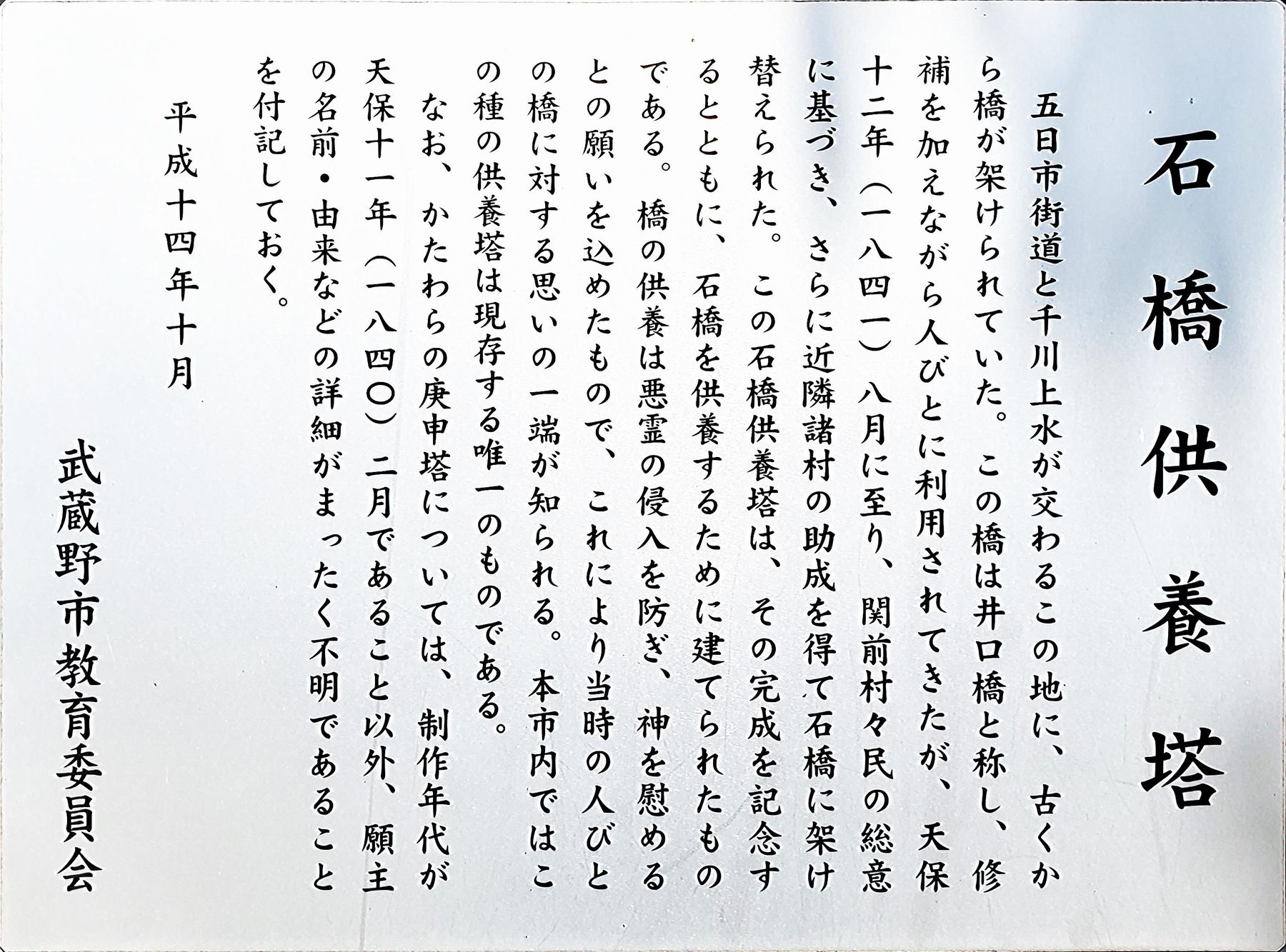 この場所は、千川上水と五日市街道が交差する場所で、古くから橋が架けられていましたが、天保12年(1841)に石橋に架け替えられたのを記念して石橋供養塔が建てられたとあります。