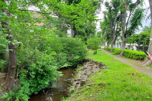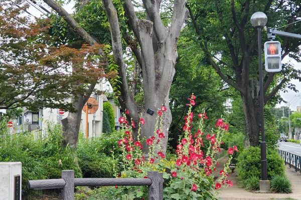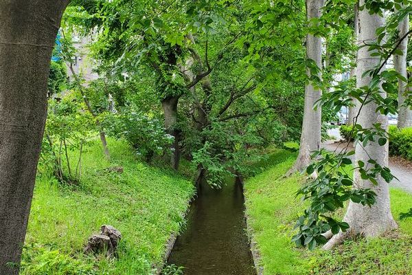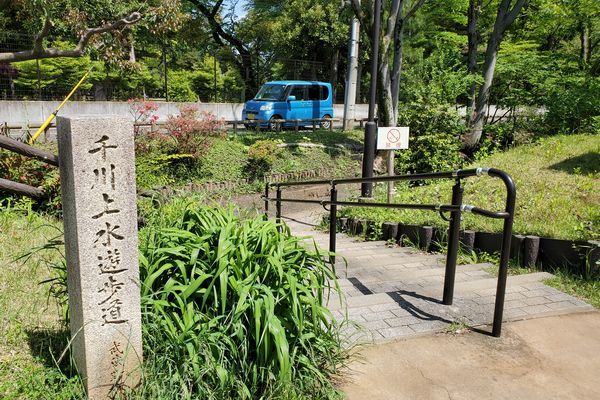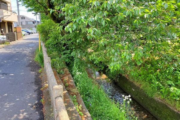 取水口で分岐した千川上水は、五日市街道を暗渠でくぐると、開渠になり、五日市街道の上下線の間を武蔵野大学前まで流れて行きます。
