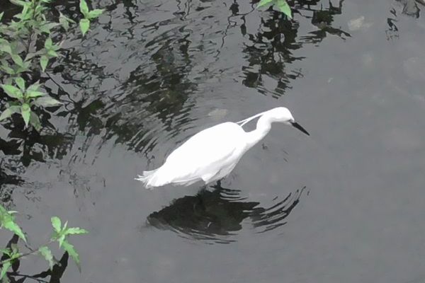 コサギが水の中を歩いていました。水の中で足をぶるぶる振るわせて歩く姿は滑稽でした。小魚をびっくりさせて捕まえようとしているのでしょう。